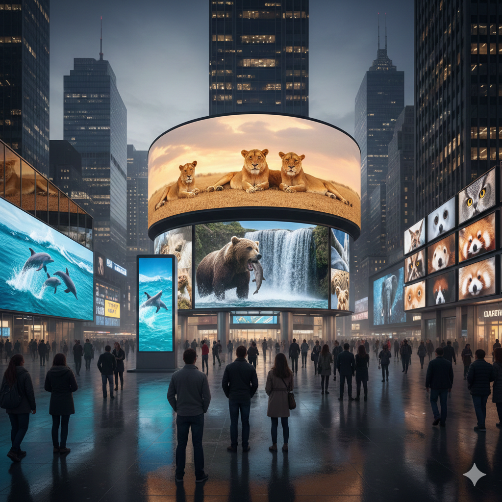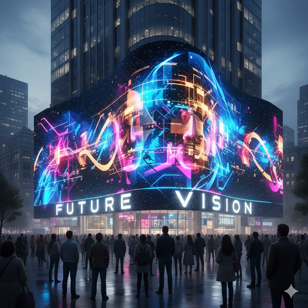 | ④ 屋外大型 LED ビジョン/動画壁面(広告・大規模施設向け) | LEDパネル(高輝度・防水)+制御装置+屋外筐体+設置工事 | 数百万円〜(規模により大きく変動) | 維持費・電気代・保守で月数万円〜数十万円 | 駅前広告、イベント案内、大型施設誘導、屋外プロモーションなど |